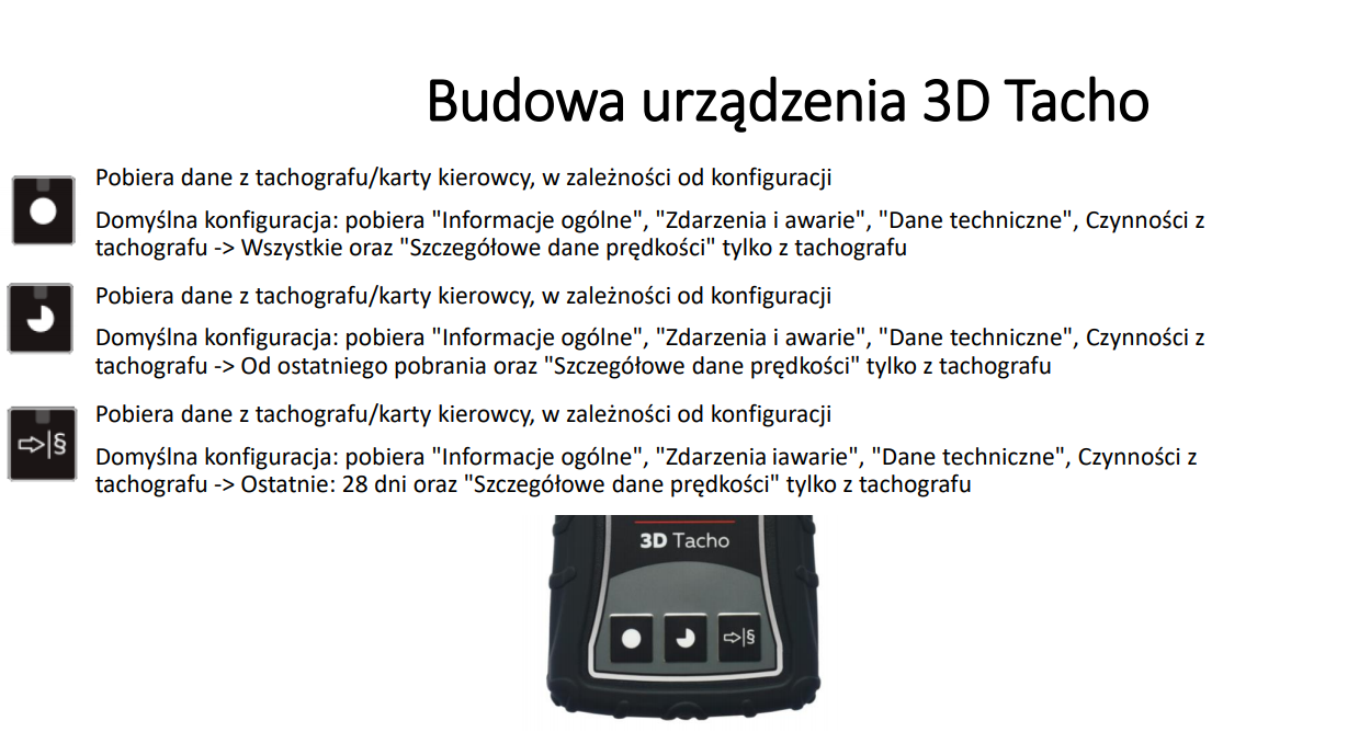- Pobieranie danych z karty kierowcy (za pomocą wbudowanego czytnika kart bez konieczności podłączania do tachografu) wystarczy wsunąć kartę a pobór danych z karty kierowcy jest automatyczny