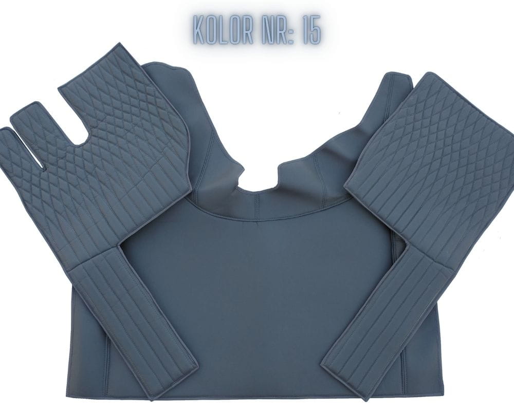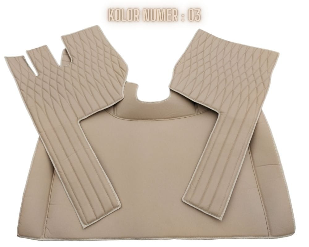 Dywaniki Premium Class to wyjątkowa kompozycja kolorystyczna oraz najwyższa jakość wykonania połączona z idealnym dopasowaniem do podłogi pojazdu. Boczne elementy dywaników znajdujące się pod nogami mają grubość 2 cm (ewentualnie 1 cm), oraz posiadają eleganckie przeszycia. Produkt został wykonany z wysokiej jakości skóry syntetycznej, dzięki czemu jest zarówno w pełni praktyczny jak i idealnie wpasowuje się we wnętrze kabiny, sprawiając że staje się ona miejscem przytulnym i miłym dla oka. Ten zestaw dywaników jest szczególnie ceniony przez kierowców z uwagi na wysoką jakości wykonania.