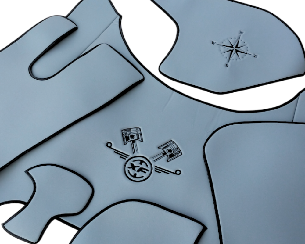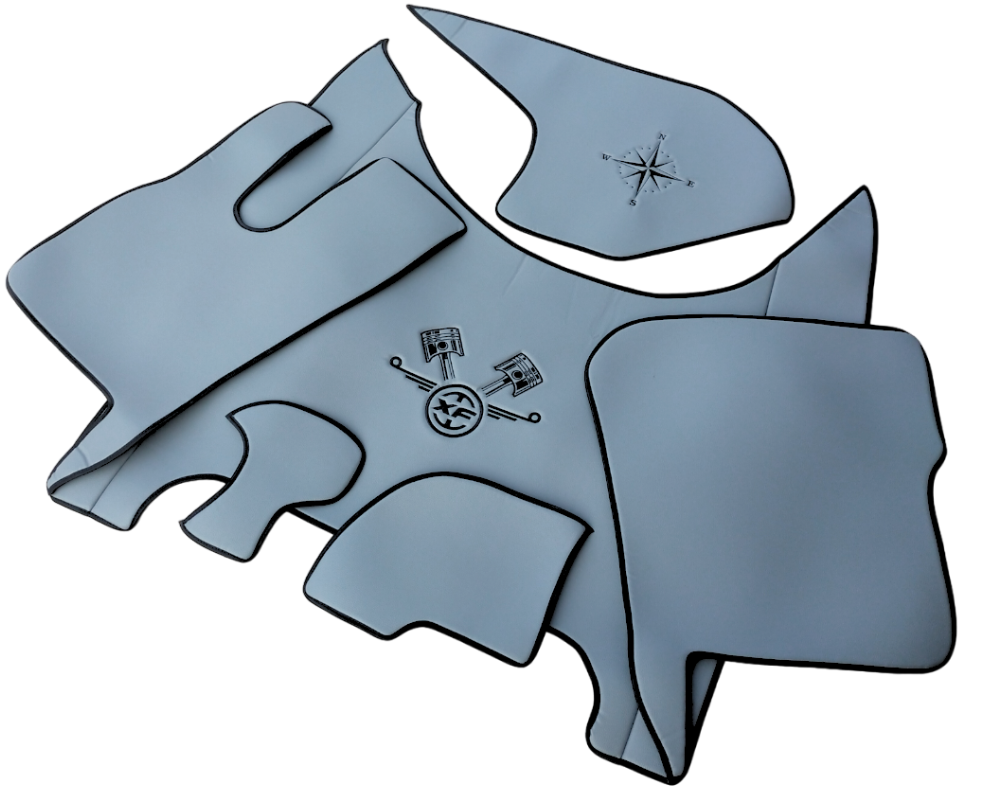Dywaniki to wyjątkowa kompozycja kolorystyczna i najwyższa jakość wykonania. Produkt został wyprodukowany z wodoodpornej gładkiej skóry syntetycznej, dzięki czemu jest zarówno w pełni praktyczny jak i idealnie wpasowuje się we wnętrze kabiny, sprawiając że staje się ona miejscem przytulnym i miłym dla oka. Ten zestaw dywaników jest szczególnie ceniony przez kierowców z powodu wygody w użytkowaniu. Idealnym dopełnieniem całości są dwa estetycznie wykonane hafty jeden na dywanie środkowym drugi na poduszce znajdującej się na desce rozdzielczej.