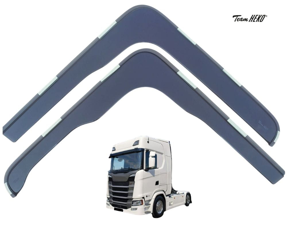 Estetyczne, delikatnie przyciemniane owiewki na okna marki Team Heko, dedykowane do pojazdów ciężarowych Scania S, R, G, P nextgen. Owiewki na okna montowane są w fabryczny otwór po którym przesuwa się szyba, bez wiercenia w fabrycznych prowadnicach szyb, co zapewnia idealne dopasowanie i łatwy montaż.