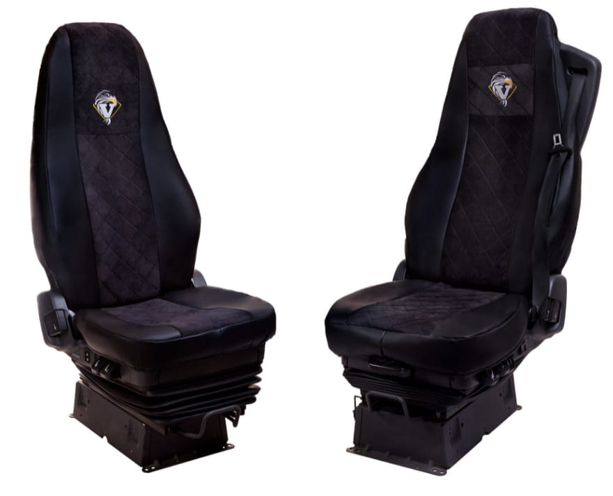 Pokrowce na fotele uszyto z dwóch rodzajów materiału. Środkową część wykonano z materiału sztruksowego o dużej przepuszczalności powietrza, co zapewnia odpowiednią wentylację siedziska i duży komfort pracy podczas wielogodzinnych tras. Dopełnienie całości stanowią skórzane boczne gładkie elementy, które są bardzo trwałe i wygodne w eksploatacji.