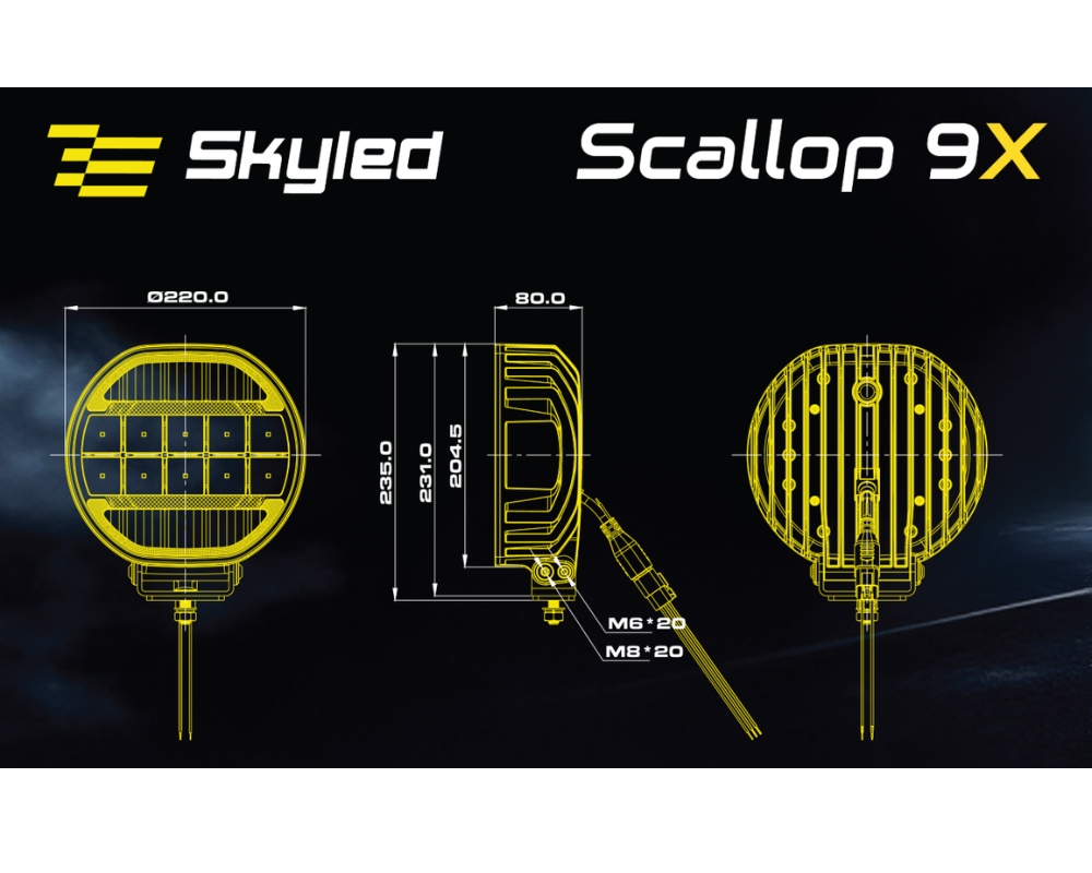 Reflektor dalekosiężny Skyled SCALLOP 9X (180W) to światło o potężnej mocy, zapewniąjące świetną widoczność podczas jazdy po zmroku. Produkt ma nowoczesny wygląd przez co jest doskonałym dodatkiem tuningowym do towjego pojazdu wyróżnia go: Dywanmiczne delikatnie rozświtlające się światło pozycyjne jest dwufunkcyjne może być białe bądź pomarańczowe.