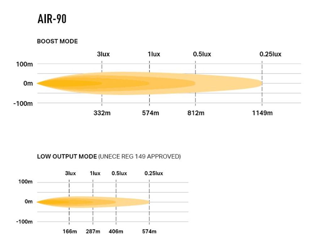 Ultra-refleksyjna optyka metalizowana próżniowo zapewnia zoptymalizowany wzór wiązki do codziennego użytku na drodze, w tym w wyższych pozycjach montażowych nad drogą. Niezwykła nowoczesna konstrukcja lampy Lazer Air-90.